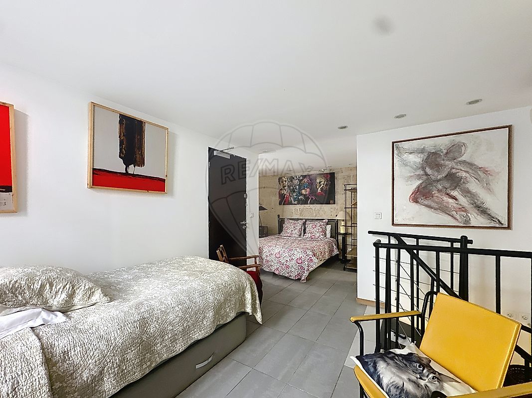 On accède au 1er appartement par un bel escalier en pierre. Se découvre une belle pièce à vivre avec sa kitchenette, une salle d'eau et à l'étage une chambre de 15 m² dans la mezzanine.